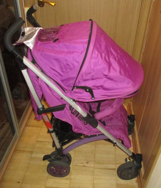 Прогулочная коляска-трость тоже с проблемками - без резиновой подножки (в спальном положении для малыша она и не нужна) и плохо складывается - погнута одна тяга, мужик с руками поправит без проблем. Хотя лучше один раз разложить и так и хранить между прогулками. Сломан левый фиксатор "капюшона", иногда может выпадать. В общем, для деревни пойдёт. Хотя сама ткань в хорошем состоянии, коляска лёгкая и с проходимостью нормально.