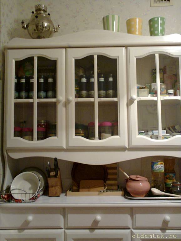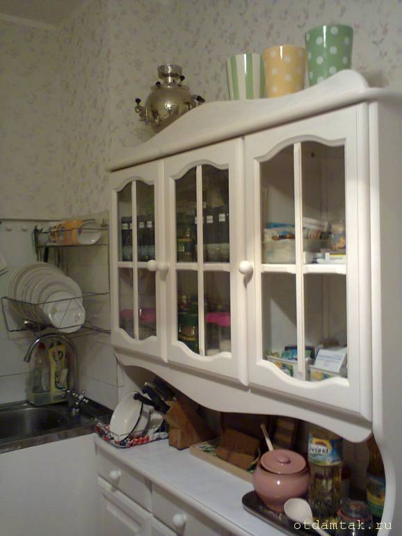 Еще можно воспользоваться компактной мебелью - не со стандартной глубиной в 60 см, а глубиной 36 см. Пишу такой точный размер, потому что у меня сейчас такая мебель. Огромная 7-ми литровая кастрюля в буфет помещается запросто.