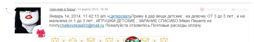 здравствуйте очень нуждаемся в детской одежде для девочки 3 годика и обуви,женской одежде 48 размера,мужская одежда 50 размера, игрушках, средствах личной гигиены кто нибудь откликнетесь помогите пожалуйста пересылку если что оплатить сможем!!!Всем спасибо за понимание!Пишите в личку или на почту chaikovskaia93@mail.ru так как не всегда есть возможность ответить