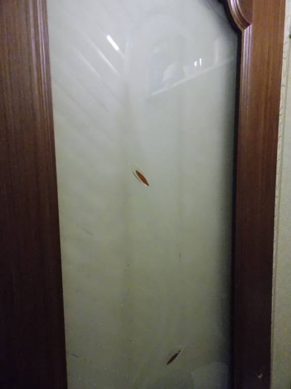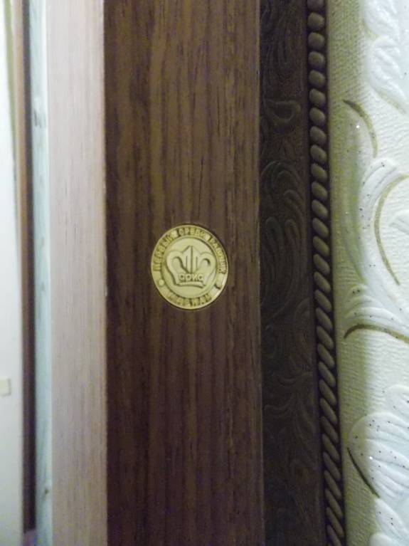 Из внешних дефектов — слегка облущивается лак, но если хорошо отмыть и пройтись полиролькой, будет почти незаметно. Оттиск фирмы «Ариа». Коробки и наличников нет, чисто дверь.