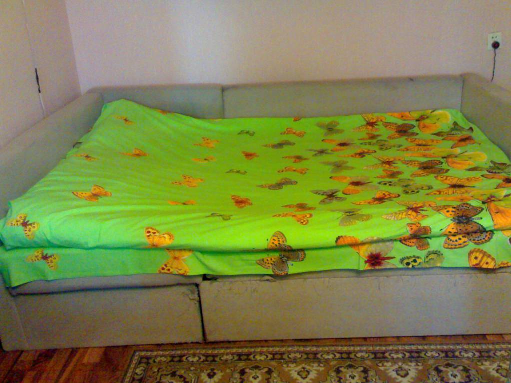 Большой, широкий, удобный. Спальное место 2-спальное, жесткое. Есть дефекты (пятна на обивки сидения, подран котом). Внутри место для хранения подушек (в комплекте с диваном).