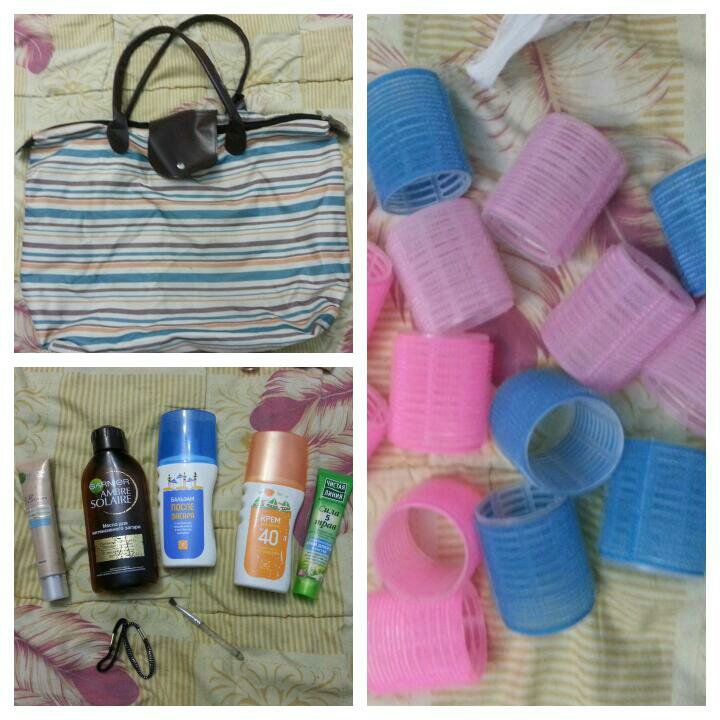Сумка пляжная (обмахрились ручки) ; тональный крем и масло для загара - чуть-чуть. Крем после загара и крем для рук - полные.