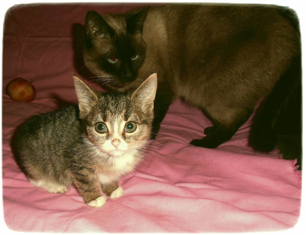 Была подброшена под дверь в возрасте 1 мес. На последнем фото Умняша с приемной мамой.