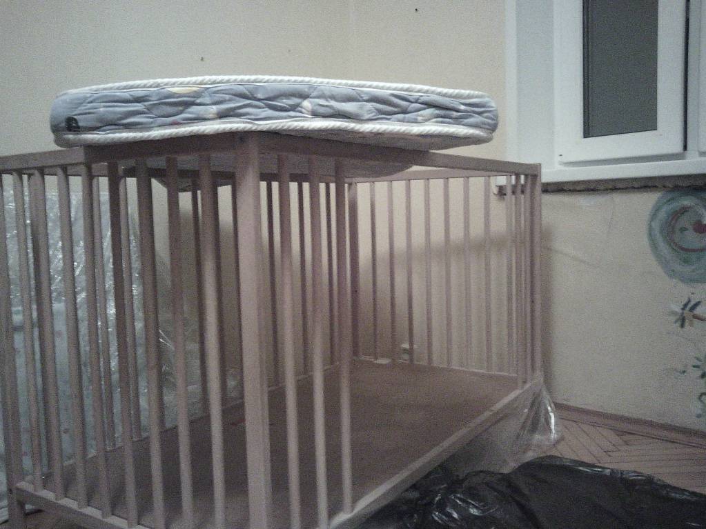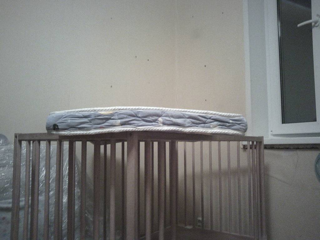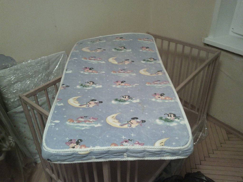 Детская кроватка из Икеи с выпиленными частями (что б ребенок мог сам ложиться) 2 уровня. Если закрыть "дырку" то можно использовать для новорожденного. Мы придвигали к своей кровати что бы можно было заснувшего у нас ребенка спихнуть в его кроватку. Матрас кокосовый натуральный. Две простыни и пододеяльник. Сокольники.