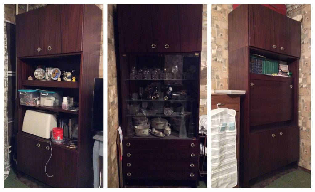 Стенка из 4-х шкафов. Библиотека, бар, сервант и открытый шкаф с полками. Шпон в идеальном состоянии ни сколов ни царапин. 2 шкафа с идеальным состоянием механизмов дверей и ящиков. Сломан доводчик на крышке бара, нет одной створки на библиотечном шкафу.