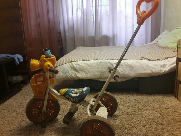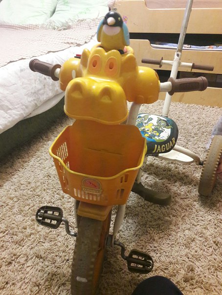 отличный велосипед , оранжевого цвета , как для мальчика , так и для девочки , впереди игрушка птица пищит, и играет музыка, есть передняя корзинка и отдельная часть для спинки, колеса большие . живу в старых химках