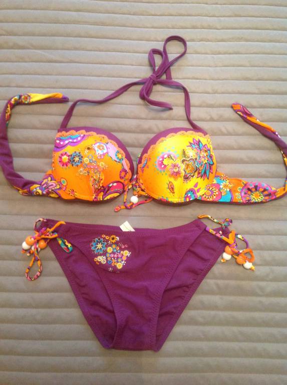 купальник новый на 42 размер очень красивый,на грудь 70 В-С, трусики на 40 размер точно, на 42 в обтяжечку, из минусом на трусиках чуть расходятся нитки, на фото видно.
