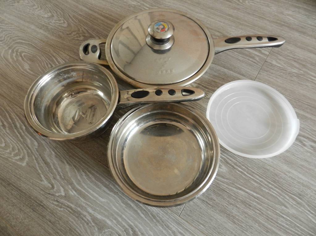 Отдам посуду из нержавеющей стали: миска с пластмассовой крышкой, ковшик и сковородка.