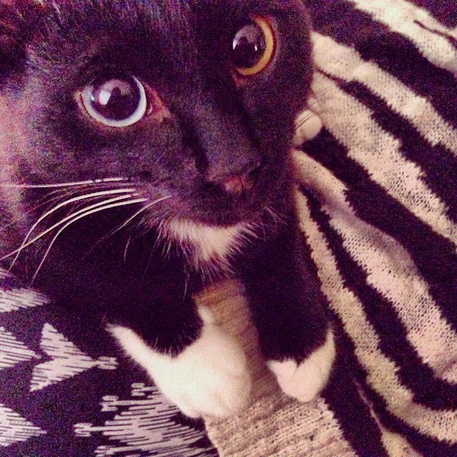 Отдам нашего разноглазого карлика. Переезжаем за город, там вокруг собаки и лисы, боюсь его потерять. Никакой забор ему не помеха, а после гибели старшего кота такое не переживу. Ему 3-й год. Размером с молодого кота, очень миниатюрный. Кастрат. Ампутирован хвост. Приучен к лотку, не дерет мебель. Не кричит. Других котов уважает (особенн жирных и теплых). Очень своеобразный, но не злой и просит ласки. Зовут Стич, на имя прибегает. Знает слово "кушать" и "эточтооотакое".
