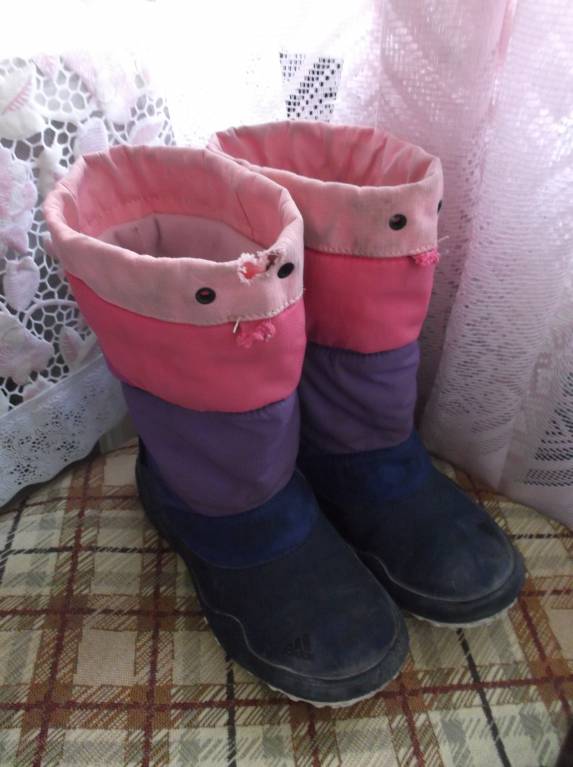 Отдам сапоги Адидас на девочку. Размер 31. Состояние сильно ношеное т.к. не отстирываются со светлой ткани пятна, и верх потёртый. Сапоги целые, чистые. На осень и тёплую зиму. Ваш самовывоз из района Косино-Ухтомский (15 минут на автобусе от метро Выхино или Новокосино) тел: (905)518-42-54 Анна.