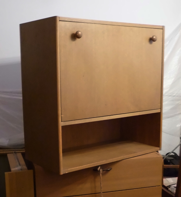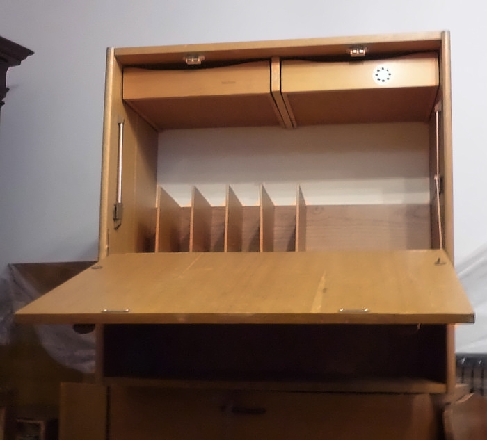 Секретер - дерево, отделка дубовым шпоном. Повреждён механизм откидывания большой створки. Но при наличии в продаже соответствующих механизмов + умелые руки, ремонт не представляет большой сложности.