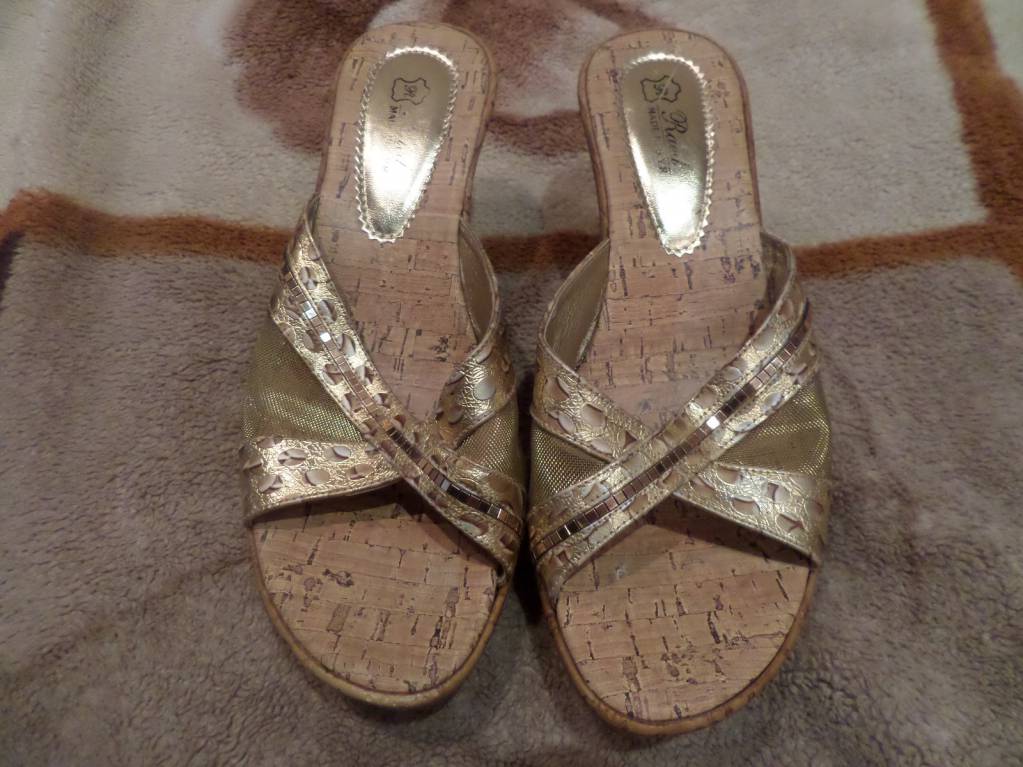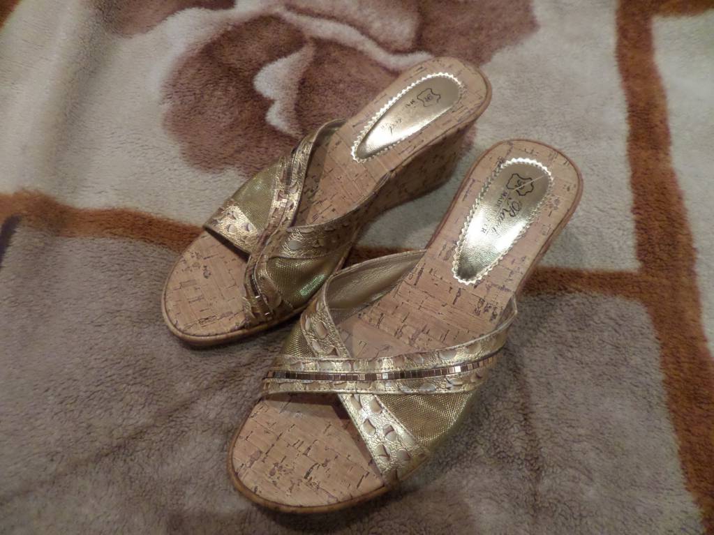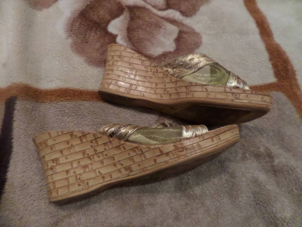 Красивые,с узорами,на танкетке,золотистые,совсем новые (были одеты 1 раз)