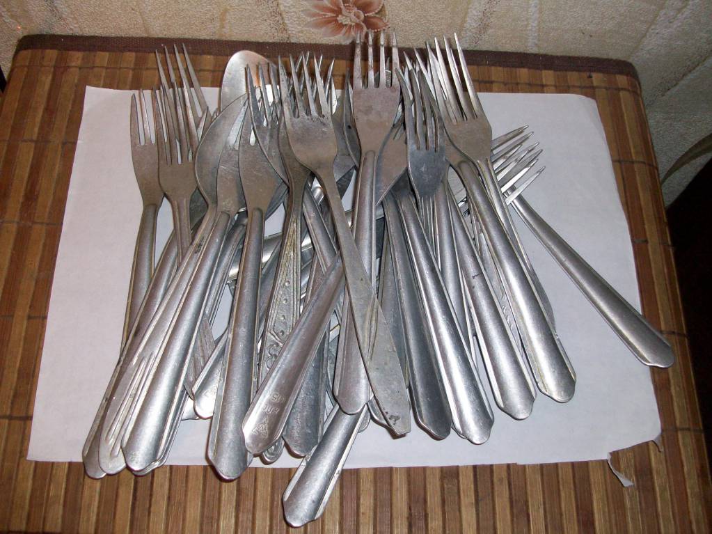 Тарелка большая Ложки и вилки,алюминевые А эти думаю заинтересуют тех кто сдает цветные металлы,куча алюминевых ложек и вилок.Потемнели от того что их замочили в какой то химии.Для еды думаю не пригодны.Ради интереса взвесил,целый килограмм чистого алюминия