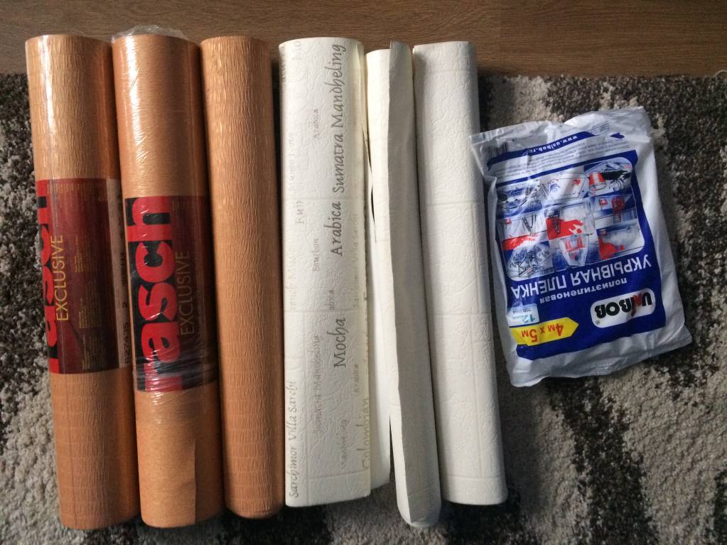 Остались обои после ремонта. 2 рулона запечатанные, 3 остатки белые. + пленка полиэтиленовая укрывная для ремонта.