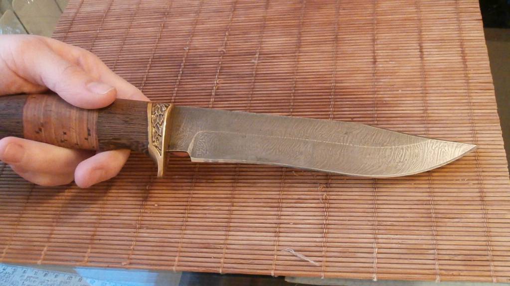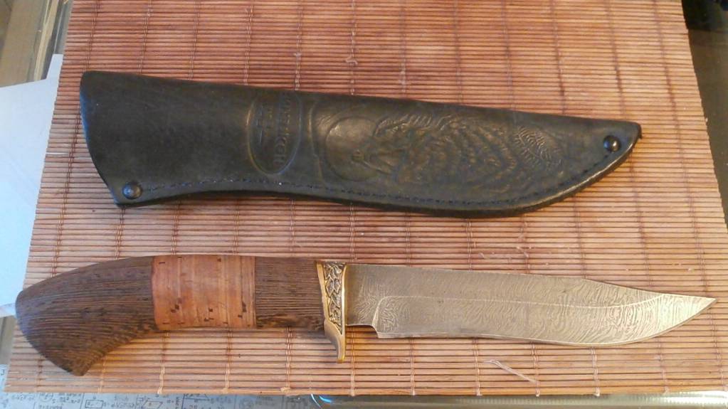 Нож дамасская сталь, ручная ковка, ножны родные из кожи. Пару раз был в употреблении в походе за грибами, состояние прекрасное.