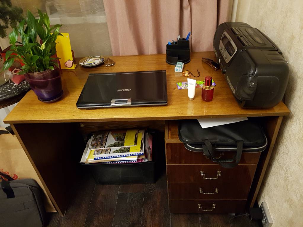 * Стол лакированный с тумбой на три ящика "школьный". Состояние рабочее. Потертости и трещинки есть. Цена за стол 300 рублей, цена за ящик 100 рублей.