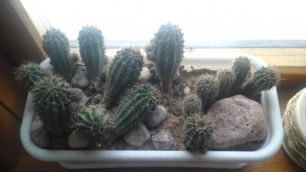 Вот такая вот композиция. ))) Дарится все вместе, с горшком и поддоном. Фото не очень, тк разрешение не важное, но увидеть можно. Один кактус слегка лег, к свету тянулся, тк подоконник в тени. Если поставить на хорошо освещенное место, все выпрямится и будет замечательная «картинка».