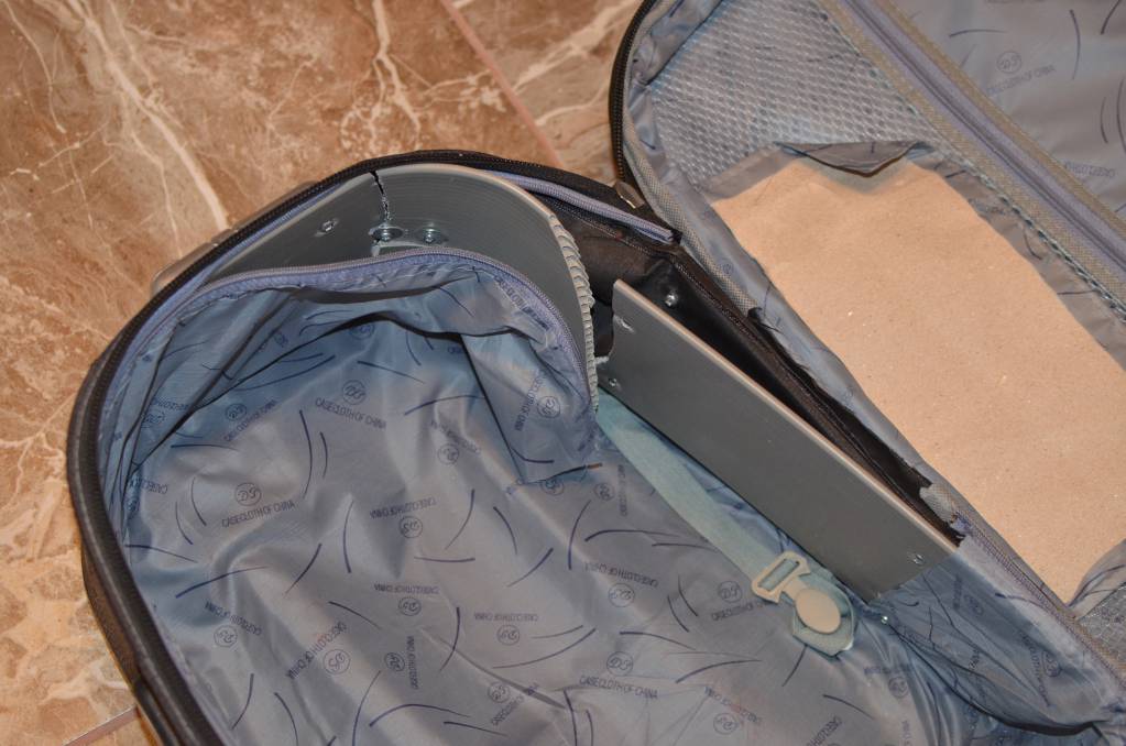 Из существенных недостатков - внутри сломана пластиковый основа, нет одной ножки, сломаны второстепенные молнии. Колеса на месте, ручка неидеально, но работает, основная молния в порядке.