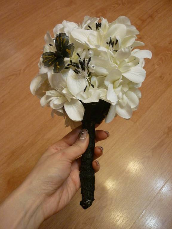 Отдам свой свадебный букет из искусственных цветов. Их называют брошь букеты, делала сама. Цветовая гамма - чёрно-белые тона. отдаю бутоньерку, букет и заколки в волосы. У меня были длинные, волнистые.