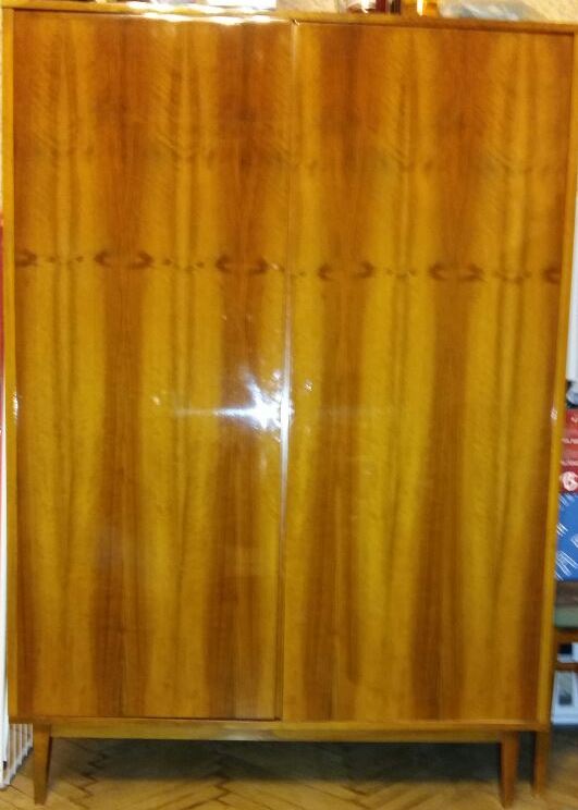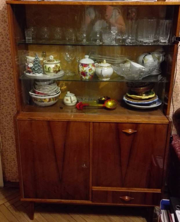 Одежный шкаф и сервант из набора, темного цвета. В шкафу заменить держатели под полками