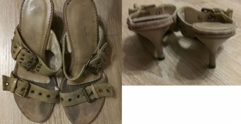 Босоножки 35 размера на небольшой шпильке. Есть царапины на каблуках сзади, но их не очень заметно из-за цвета босоножек.