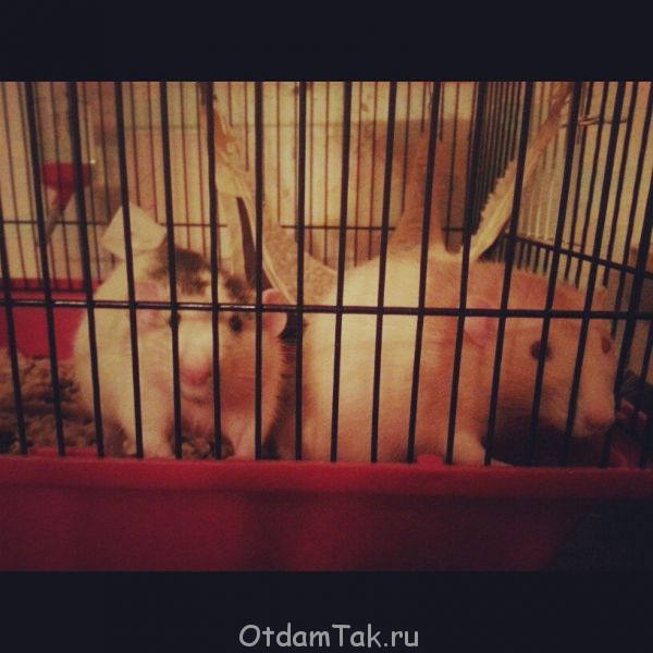 Отдаю даром двух однолетних мальчиков крысят дамбо (у них клевые ушки). Вместе с клеткой, поилкой/кормилкой, наполнителем для клетки и кормом. Один рыже-белый с красными глазами, другой бело-черный с черными глазами. Дружелюбные. Ребенок за хвост их таскал - и то не кусались. Очень много у меня гуляли по дому - грызли только провод зарядки от планшета и ничего более