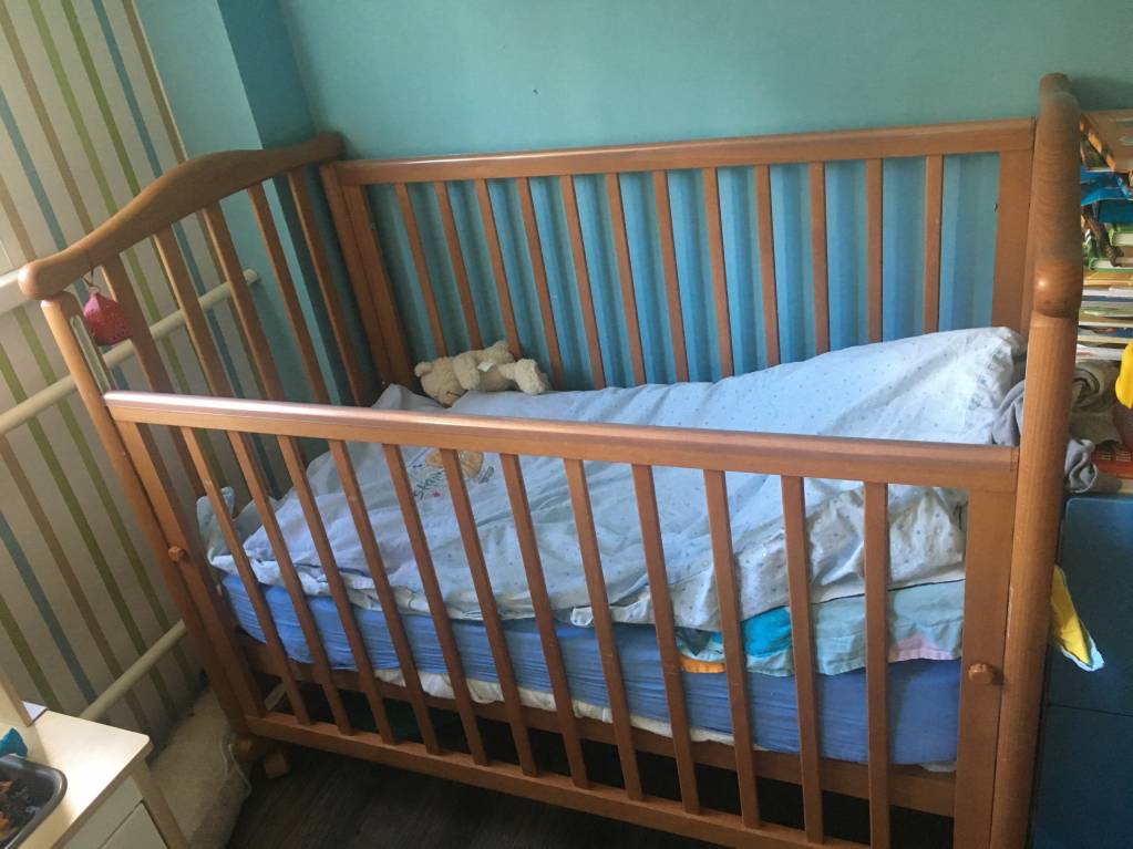 Кроватка бук, борты закрыты мягким пластиком, есть 2 положения по высоте матраса и бортика. Есть отметины от зубиков малыша на на узких бортах( малозаметно). Есть матрас, пост белье. Стул PegPerega prima papa регулируется спинка в неск положениях, поднос можно снять, есть ремни, подножка, легко складывается . Цвет серо зелёный, состояние рабочее, можно поменять сидушкку, тк она имеет повреждение.