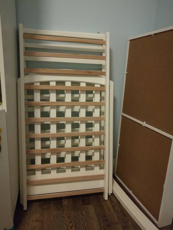 Есть небольшие дефекты, но не критично. У пару колес сломались фиксаторы, но при желании можно заменить. Кровать в разобранном виде.