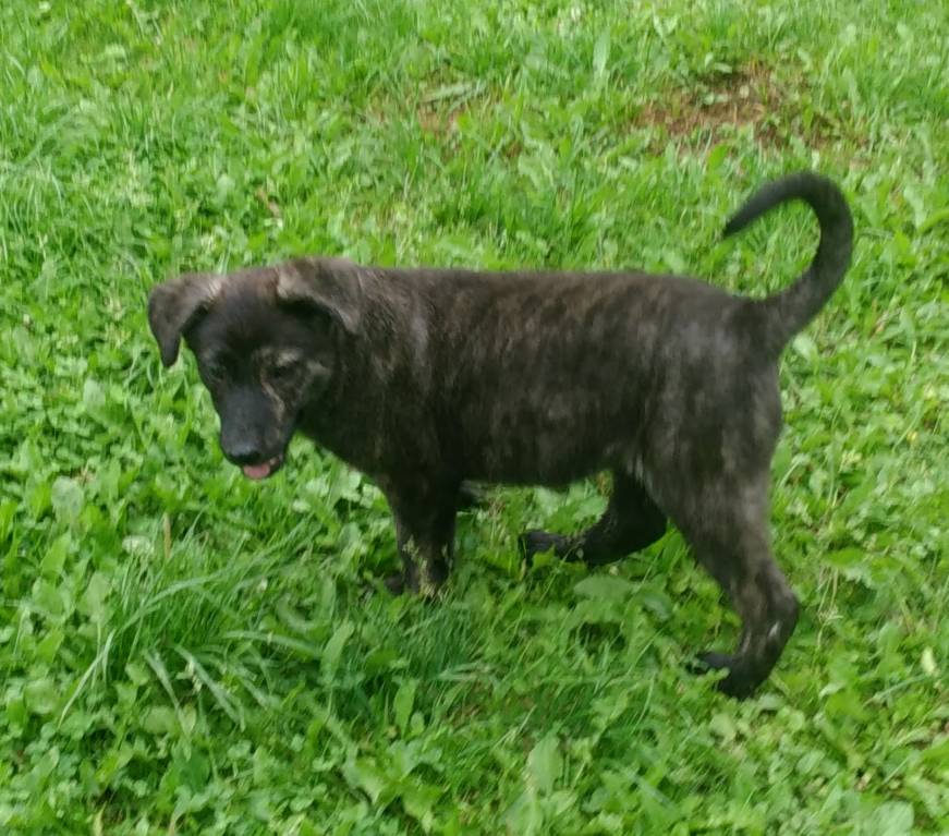 Возраст — три мес. Окрас — тигровый: тёмно-темно-серый с коричневым (на фото видно), на груди посередине белое маленькое пятно. Шерсть короткая густая мягкая. Будет достаточно крупным серьёзным псом. Пока весит 8 кг, ожидается во взрослом возрасте около 25-30. Сейчас мягкий весёлый, игривый, не агрессивный (в силу породы — пока щенок, даже немного пугливый), и что важно — послушный: выполняет команды «сидеть», «ко мне», «фу», «дай лапу» чаще, чем не выполняет. Выучил команды быстро. Кличка «Чарли», но пока охотнее отзывается на «Хор-роший». Очень ласков с детьми. Играет с мячиком и палкой. Терпелив к душу, процедурах вычесывания (ему последнее с его шерстью требуется не часто). Хорошо переносит транспортировку в коробке в машине (к ветеринару ездили). Спокойно отнёсся к домашней кошке и она перестала на него в шар превращаться.