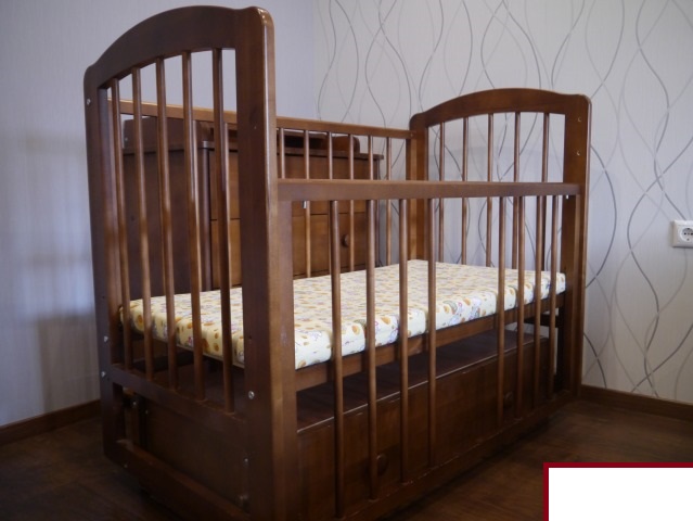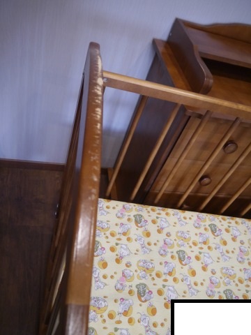 есть небольшие сколы на углах, у кроватки погрызена одна боковина