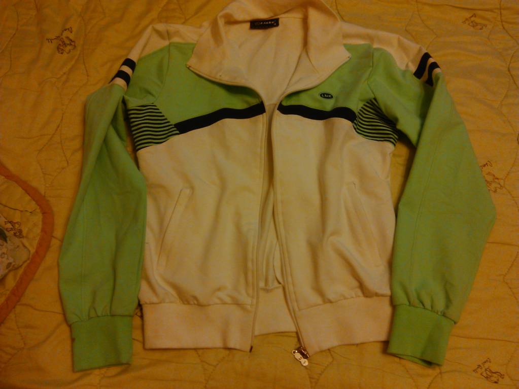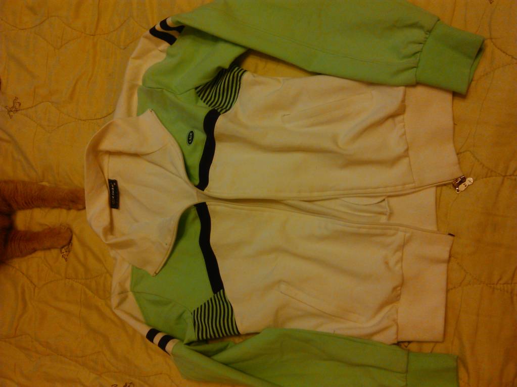 2. Верх от спортивного костюма размер М Турция, 77%хлопок, 17%полиэстр, 6%эластан, плотный,носился очень мало, незначительное пятнышко снизу на правой поле, при носке не видно совсем. Фото врет, цвета - сливочный и салатовый, очень приятные