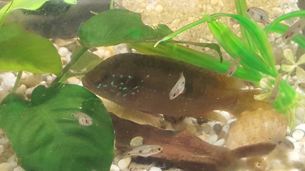 пара хромис-красавцев приносящие периодически потомство. А также их потомство (1-2см)