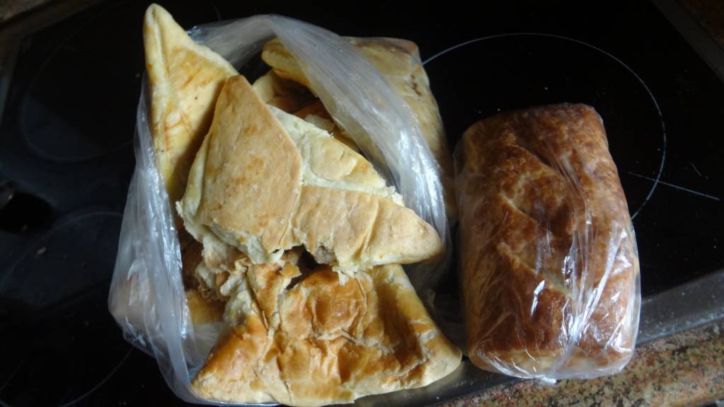 Хачапури полопаные - за качество не ручаюсь (вроде пахнут хорошо, без плесени), пирожок с печенью, слойка с ветчиной - отдали с пекарни.
