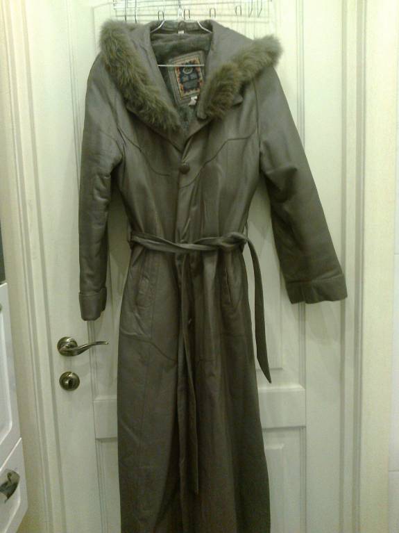 пальто р. 48-50 в нормальном состоянии. Непромокаемое, с капюшоном отороченным мехом, искусственная кожа в хорошем состоянии, подкладка подбита тонким синтепоном, до талии подстежка на искусственном меху, легко в уходе, незаменимая вещь в деревне. Самовывоз.