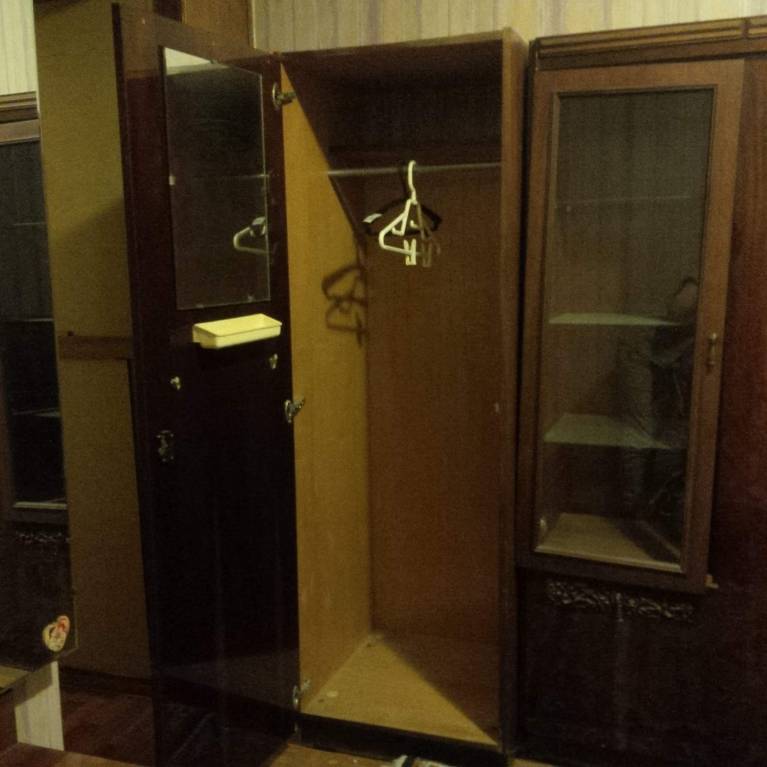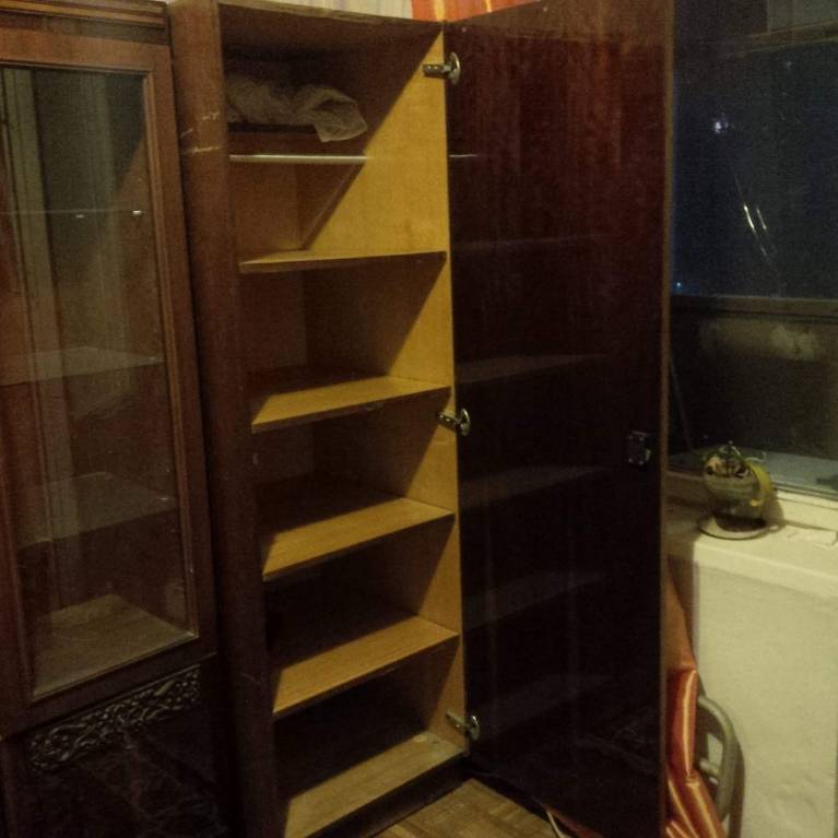 Три отдельные части. Средняя со стеклянными полками для книг и посуды, боковые для одежды и вещей. Состояние хорошее! Толстый мебельный шпон выглядит как натуральное дерево. У левой стеклянной дверцы надо укрепить нижнюю петлю.