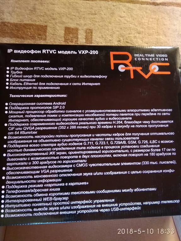 Комплект: коробка, видеофон, трубка, шнур к трубке, шнур к интернету, адаптер.