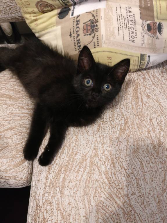 Отдадим в добрые руки котёнка, девочка, 2.5 месяца. Цвет тёмно-коричневый (практически чёрный). Приучена к лотку. Ест как покупной корм (сухой и влажный),так и отварную курицу, и овощи.