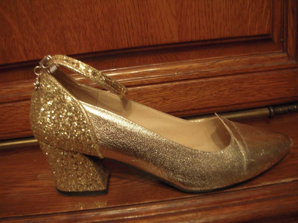 Туфли золотого цвета на удобном устойчивом каблуке на размер 38 или 37,5 (на мой 38,5 тесноваты), носились немного, на не широкую ногу (узкую или среднюю).