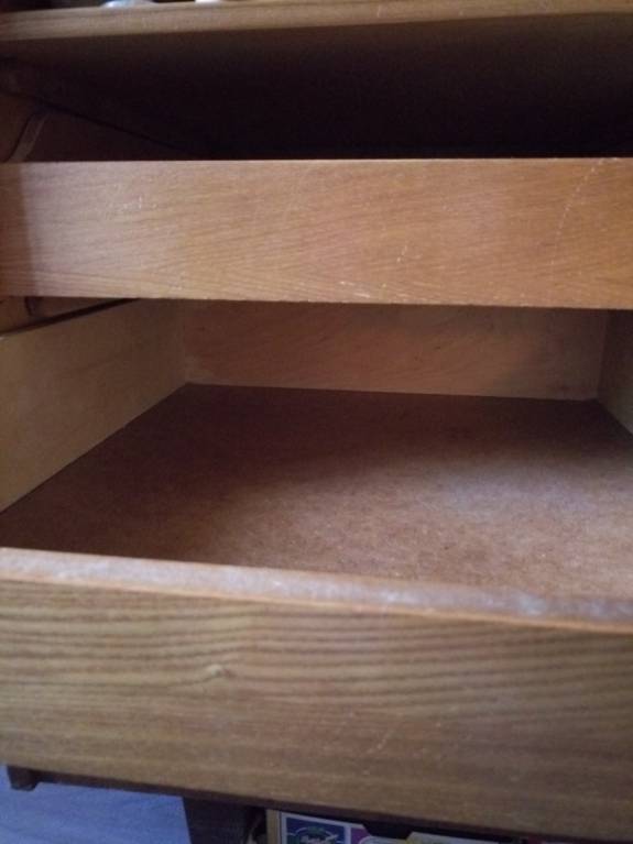 В левом отделении три полки и три ящика, в правом - отделение для вешалок. На двери зеркало.