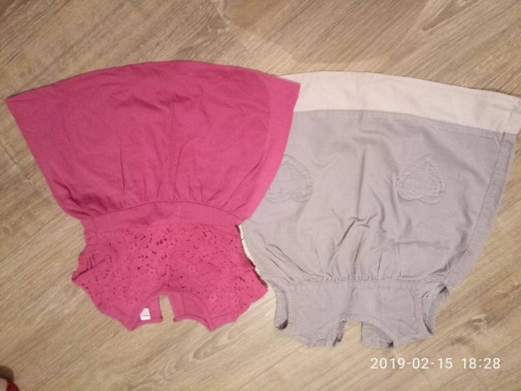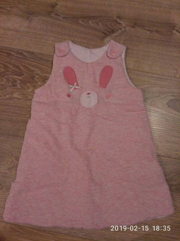 Даром. Размеры 68, 74 у платьев, 80 у ветровки и комплекта. Мы носили в период примерно от 6 месяцев до года с хвостиком.
