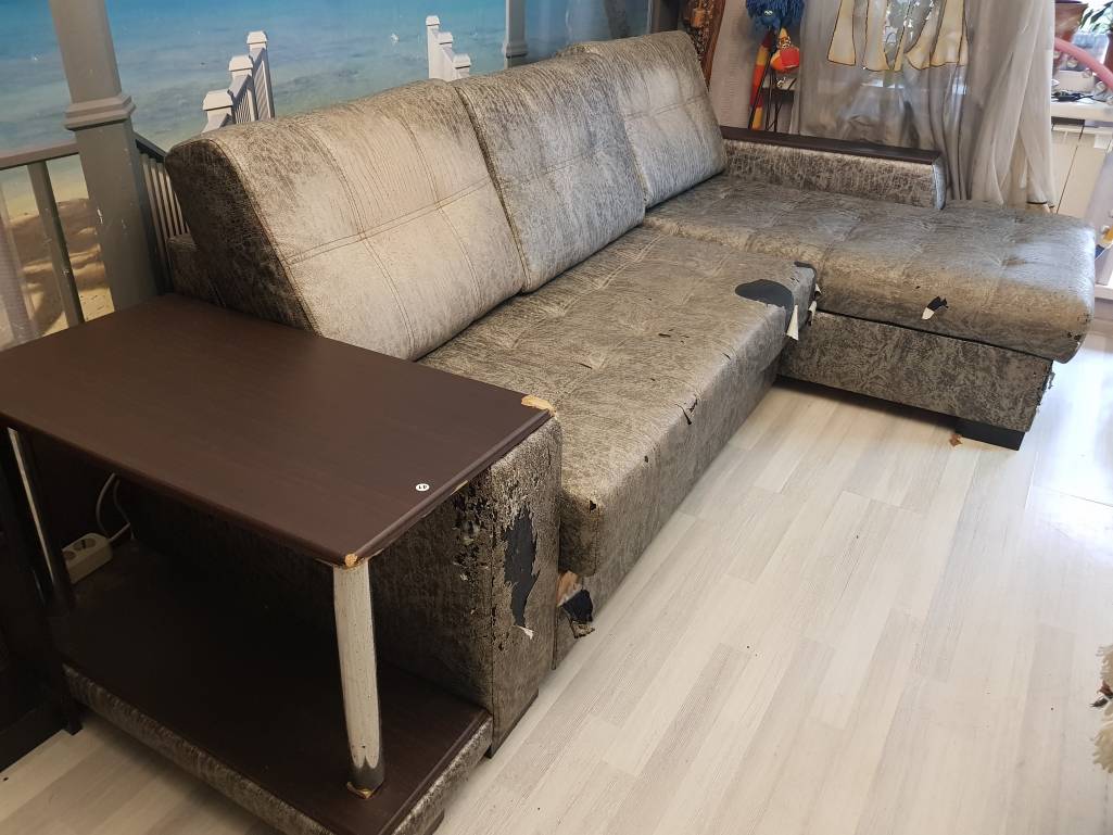 Угловой диван, не подавлен, механизм отлично работает, удобный и большой ящик для белья, но...нужно менять обивку (сейчас очень тонкая кож.зам. и со временем ее разорвали моя собачка и кошка). Чехлы на подушках на молнии, их заменить вообще легко.