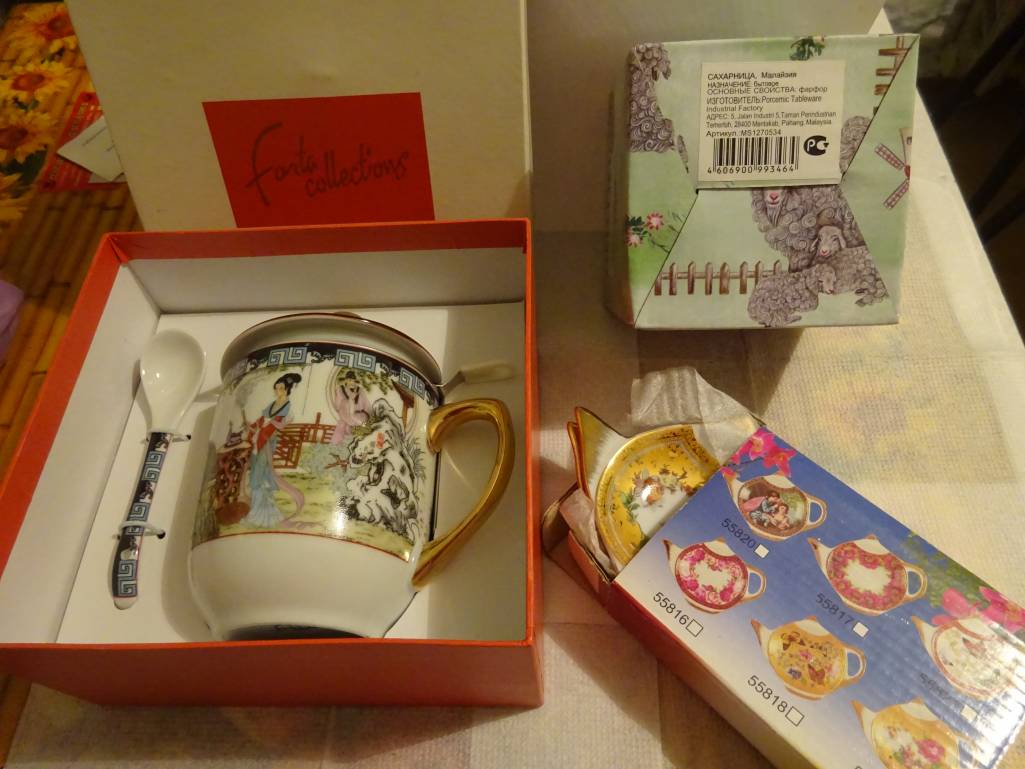 Новая посуда в упаковке (в основном, единичные экземпляры или небольшие наборы, НЕ сервизы). Можно использовать на подарки.
