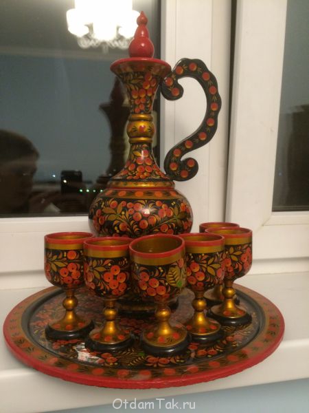 Отдадим в дар деревянный набор ( поднос, рюмки, кувшин) разрисованный в хохлому!